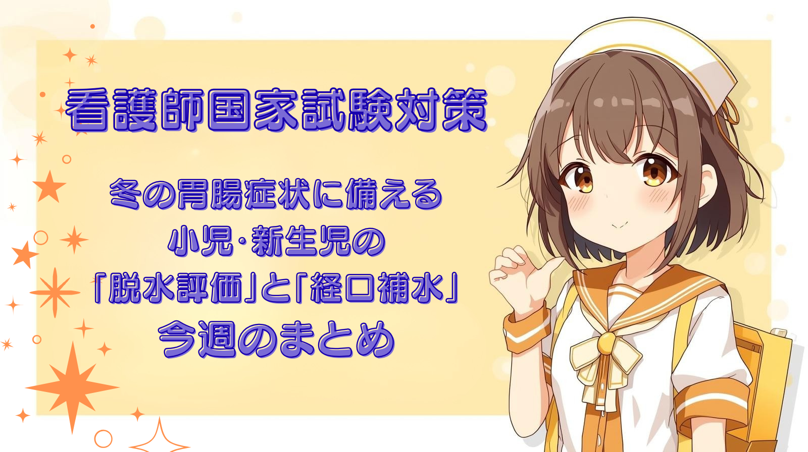 解説:家庭で共有しやすい観察は、尿(おむつの濡れ)と反応(元気・ぐったり)です。経口補水が成立しない、ぐったりしているなどの危険サインがあれば、早めに受診につなげる説明が重要です。